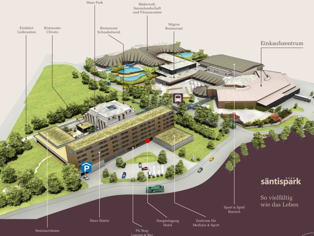 Adjacent to the hotel is the unique Säntispark leisure center with a large world of baths, slides and saunas. With the fitness center, other relaxing wellness offers and a diverse sports & games area, the leisure center offers happiness for everyone. Likewise, there are several stores in the center for daily needs and beyond.